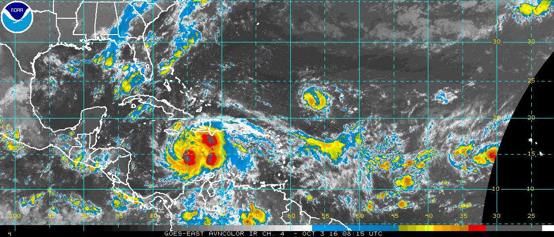 A las seis de la mañana el centro de Matthew fue estimado en los 15.3 grados de latitud norte y los 74.9 grados de longitud oeste, posición que lo sitúa a unos 540 kilómetros al sur de Santiago de Cuba, a 525 kilómetros al sur de Guantánamo y aproximadamente a 365 km al sudeste de Kingston, JamaicaEn las próximas 12 a 24 horas el huracán Matthew continuará con similar rumbo, incrementando gradualmente su velocidad de traslación, con fluctuaciones en su intensidad, aunque se mantendrá como un intenso huracán.