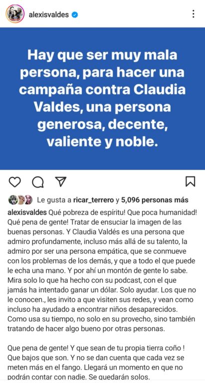 Hay que ser muy mala persona para hacer una campaña contra Claudia Valdés, una persona generosa, decente, valiente y noble”.