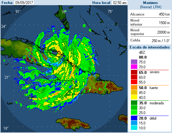 A las tres de esta madrugada el centro del intenso huracán Irma fue localizado por la red de radares del Instituto de Meteorología, en los 22.3 grados de latitud Norte y los 78.4 grados de longitud Oeste, posición que lo sitúa a unos 20 km al sur de Cayo Coco, Ciego de Ávila y 115 kilómetros al este sudeste de Caibarién, Villa Clara.