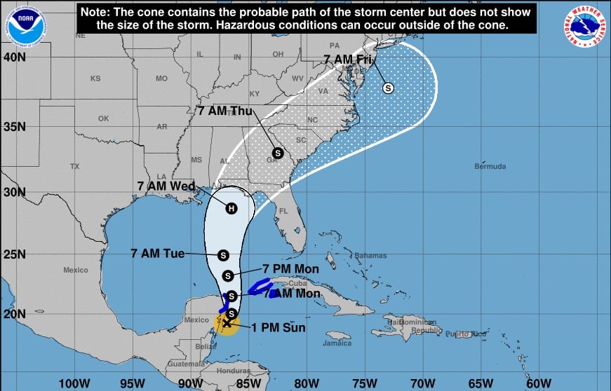 Durante las próximas 12 a 24 horas continuará su movimiento hacia el norte, incrementando gradualmente su velocidad de traslación y ganando más en organización e intensidad, cruzando durante el día de mañana por el canal de Yucatán.