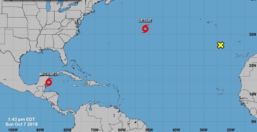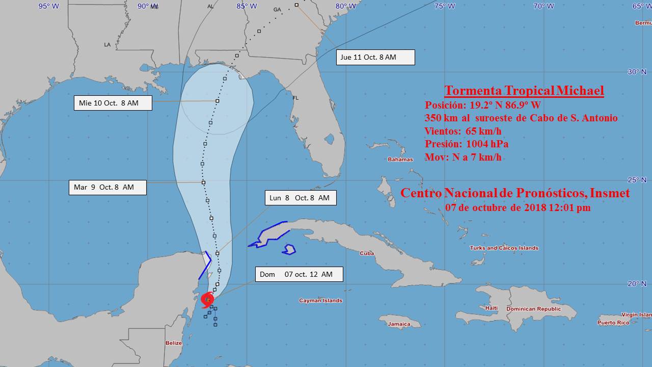 Al mediodía de hoy, el centro de Michael se estimó en los 19.2 grados de latitud Norte y los 86.9 grados de longitud Oeste, posición que la sitúa a unos 135 kilómetros al sur de Cozumel, México y a unos 350 kilómetros al suroeste de Cabo de San Antonio, provincia de Pinar del Río. La tormenta tropical Michael se desplaza lentamente al norte a unos 7 kilómetros por hora.