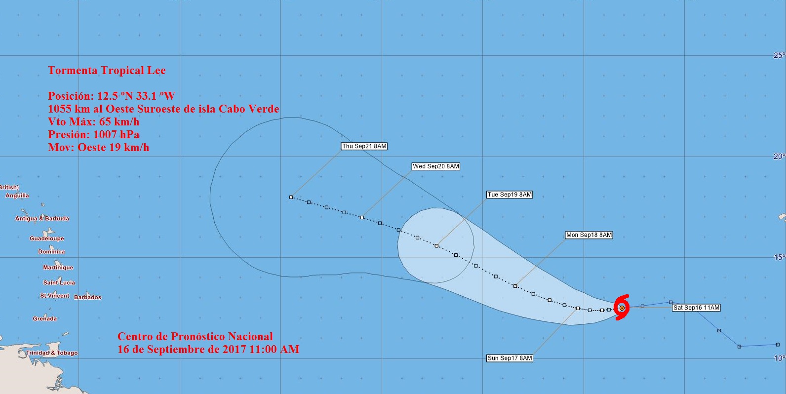 A las once de la mañana la región central de la tormenta tropical se localizó en los 12.5 grados de latitud Norte y los 33.1 grados de longitud Oeste, posición que la sitúa a unos 1055 kilómetros al oeste suroeste de las Islas de Cabo Verde. Se mueve al oeste a unos 19 kilómetros por hora.