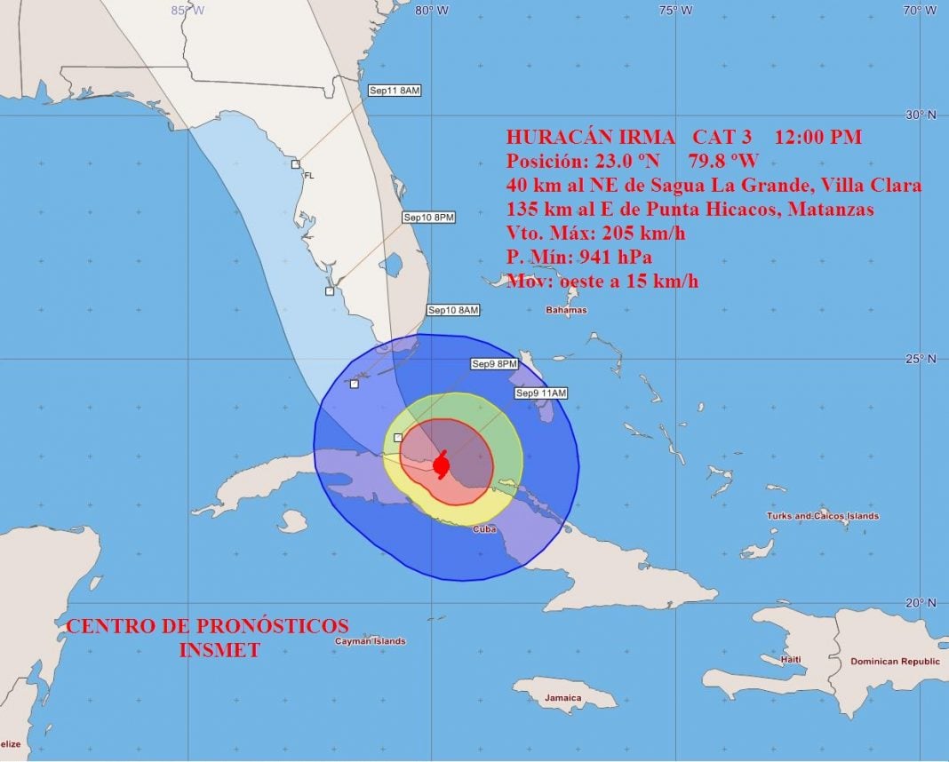 A las tres de la tarde el centro del intenso huracán Irma fue localizado por la red de radares del Instituto de Meteorología, en los 23, 2 grados de latitud Norte y los 80.3 grados de longitud Oeste, posición que lo sitúa a unos 50 kilómetros al norte noroeste de Sagua la Grande y 80 kilómetros al este de la Península de Hicacos, Matanzas. Su presión mínima se mantiene en 941 hectoPascal y avanza con rumbo próximo al oeste a razón de 15 kilómetros por hora.