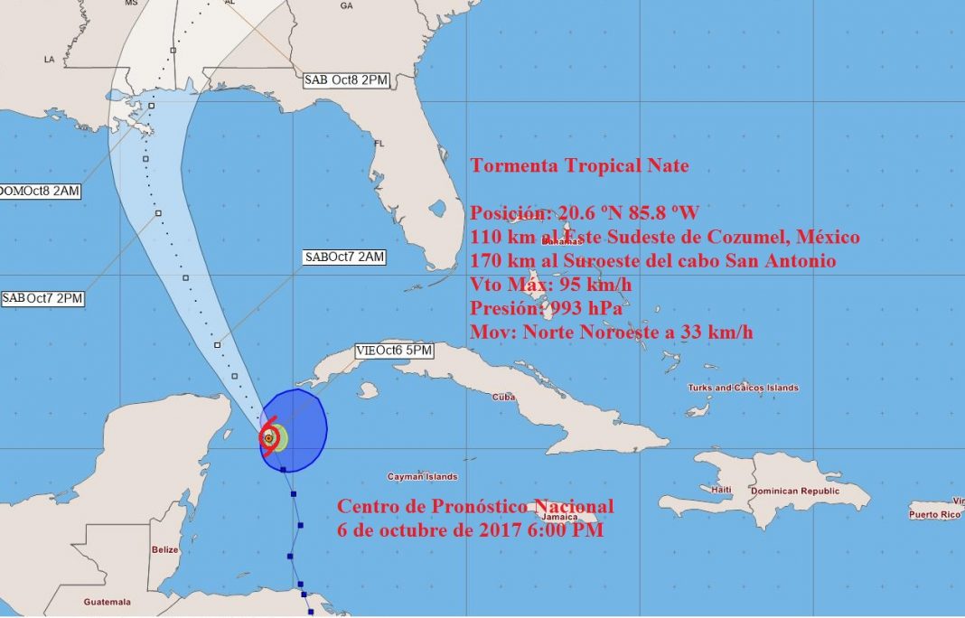 A las seis de la tarde de hoy, el centro de la Tormenta Tropical Nate se estimó en los 20.6 grados de latitud Norte y los 85.8 grados de longitud Oeste, posición que lo sitúa a unos 110 kilómetros al este de Cozumel, México y a 170 kilómetros al suroeste de cabo de San Antonio, Pinar del Río. Nate mantiene su rumbo al norte noroeste, con una velocidad de traslación de 33 kilómetros por hora.