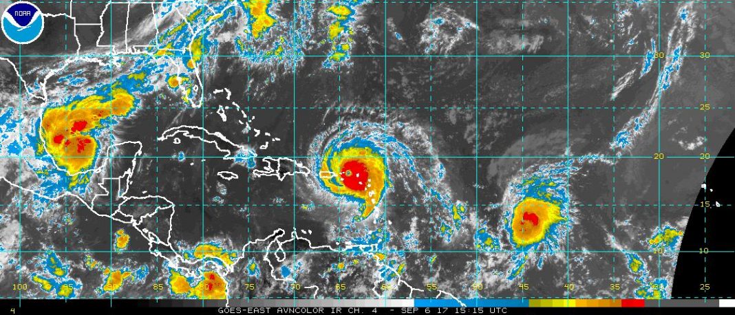 En las últimas 12 horas Irma se ha mantenido con poco cambio en organización e intensidad, pero se mantiene como un intenso huracán categoría cinco en la escala Saffir-Simpson de un máximo de cinco. Al mediodía de hoy el centro de Irma se estimó en los 18.2 grados de latitud Norte y los 64.2 grados de longitud Oeste, posición que lo sitúa a 96 kilómetros al oeste de la Isla San Martín en el grupo norte de las Antillas Menores. Posee vientos máximos sostenidos de 295 kilómetros por hora, con rachas superiores, su presión central ha ascendido hasta los 918 hectoPascal y se mantiene moviéndose al oeste-noroeste a razón de 26 kilómetros por hora.