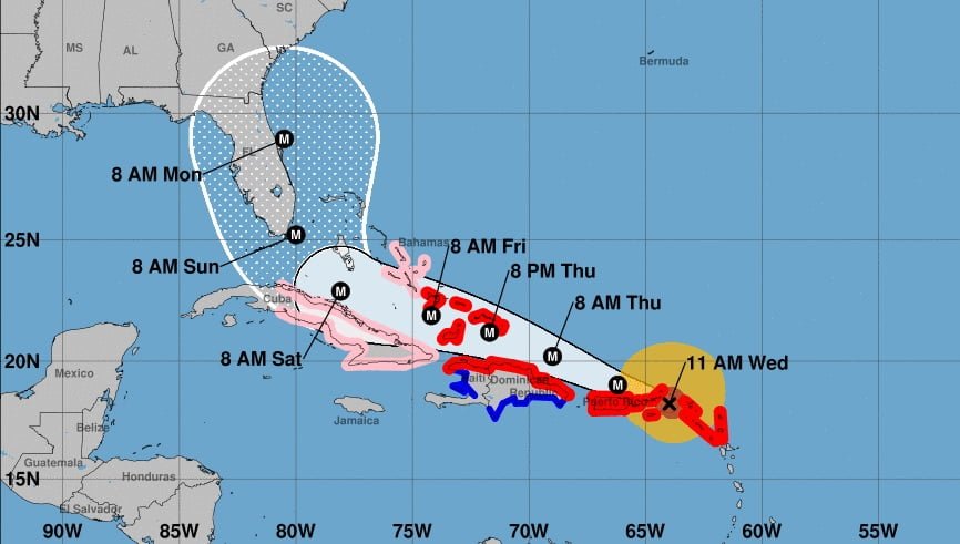 En las próximas 12 a 24 horas se pronostica que Irma se mantenga con similar rumbo y velocidad de traslación con fluctuaciones en intensidad, aunque se mantendrá como un intenso huracán. Con esta trayectoria el centro de Irma pasará al final de la tarde o primeras horas de la noche de hoy muy próximo a Puerto Rico.