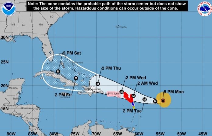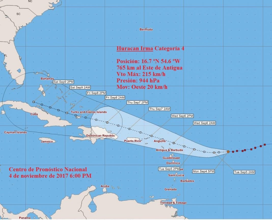 A las seis de la tarde, el centro del huracán Irma se estimó en los 16.7 grados de latitud Norte y los 54.6 grados de longitud Oeste, posición que lo sitúa a unos 765 kilómetros al este de la Isla Antigua, en el grupo norte de las Antillas Menores.