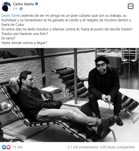 Uno de los músicos que ha salido en defensa de Leoni es Carlos Varela. «Además de ser mi amigo, es un gran cubano que, con su trabajo, su humildad y su honestidad se ha ganado el cariño y el respeto de muchos dentro y fuera de Cuba», dijo el compositor de la isla.