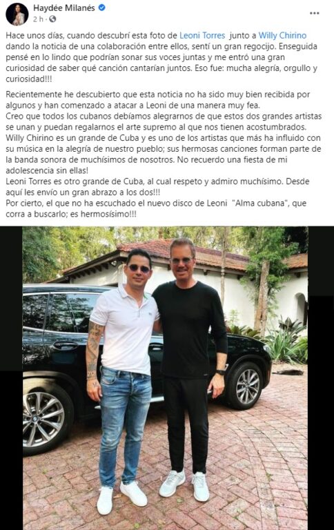 Otra artista querida, Haydée Milanés, apoyó a Leoni. «Creo que todos los cubanos debíamos alegrarnos de que estos dos grandes artistas se unan y puedan regalarnos el arte supremo al que nos tienen acostumbrados».