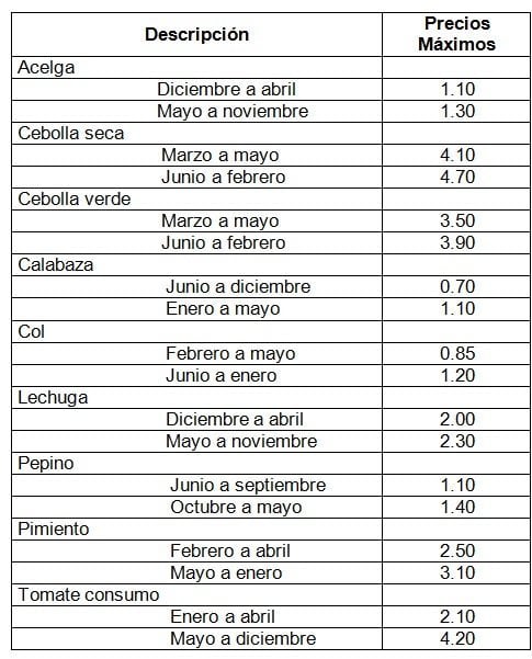 Precios máximos de venta a la población de productos agrícolas