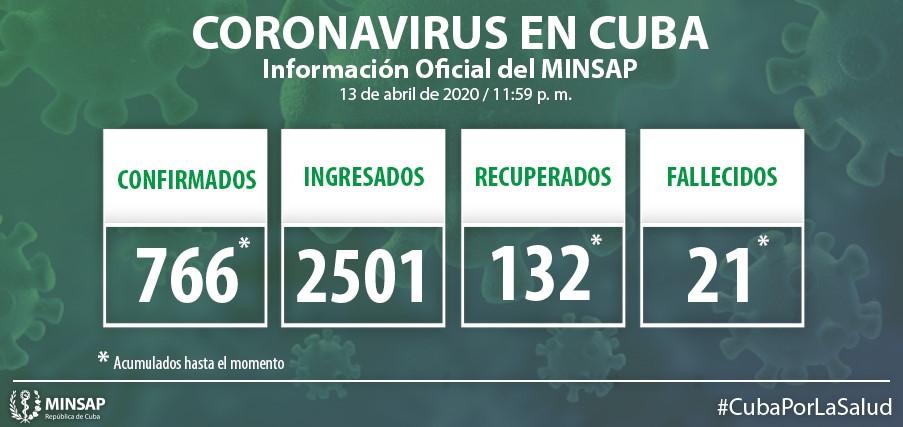 El doctor Francisco Durán García ha dado a conocer el estado actual sobre la situación del coronavirus en Cuba, que, al cierre del día de ayer, 13 de abril, se encuentran ingresados en hospitales para vigilancia clínico epidemiológica 2 mil 501 pacientes. Otras 7 mil 167 personas se vigilan en sus hogares, desde la Atención Primaria de Salud.